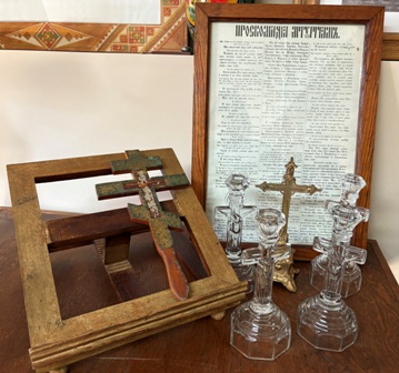 With the approval of the Vicar of Eparchial Properties and the Borshchiv council, some articles were donated to the Museum collection. The unique items included: a gospel stand, glass candle holders, the Proskomedia prayer, two hand crosses and very long and unique beeswax candles. These items have been labeled and added to the Religious Gallery display.